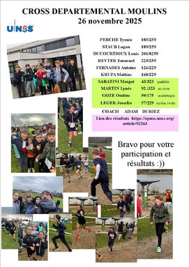 Par MARC HERVIER, publié le jeudi 27 novembre 2025 23:12 - Mis à jour le jeudi 27 novembre 2025 23:13Une belle participation de toutes et tous pour cette froide journée au parc des Ozières de Moulins ce 26 novembre 2025 liens pour le résultats : https://opuss.unss.org/article/92263 On continue pour le cross Académique sur Aurillac le 10 décembre. -